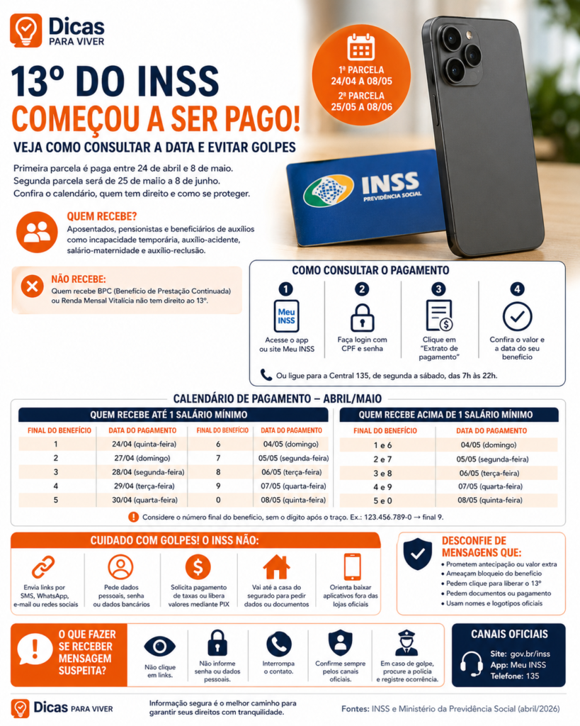 O 13º pode ajudar no orçamento, mas exige atenção. Antes de contar com o dinheiro, confira a data correta pelo número final do benefício. Antes de responder qualquer mensagem, confira se a informação aparece nos canais oficiais.