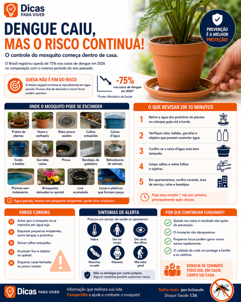 A queda de casos é uma boa notícia, mas a prevenção continua dentro da rotina. O cuidado mais eficiente é simples: procurar e eliminar água parada antes que o mosquito se multiplique.
